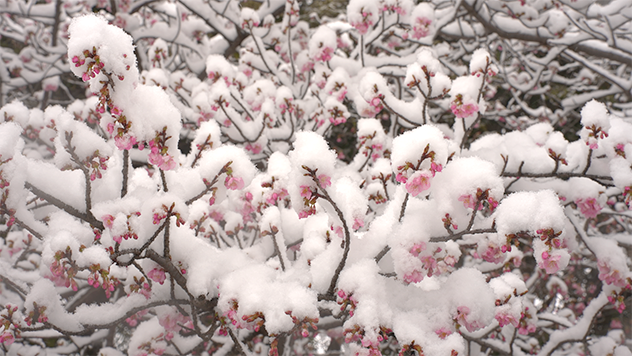 Fluffy Snowflakes Falling on Kawazu Cherry Blossoms
