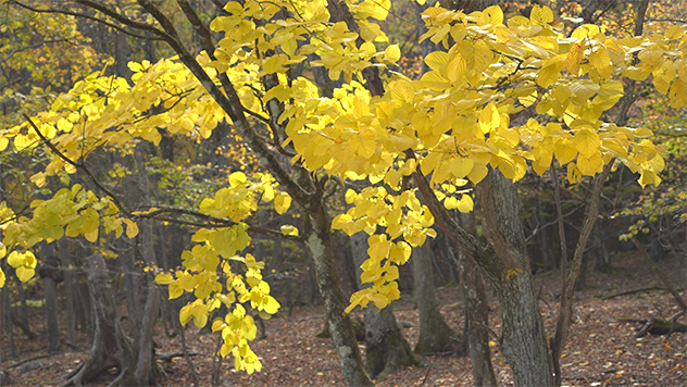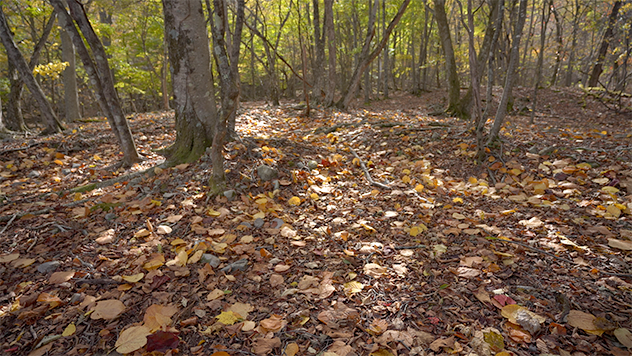 落葉の絨毯が敷き詰められた静謐な森が広がっています。