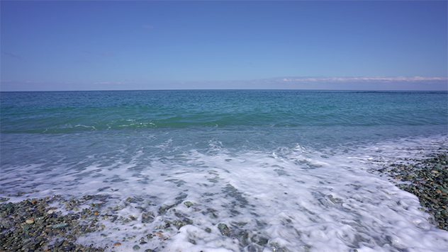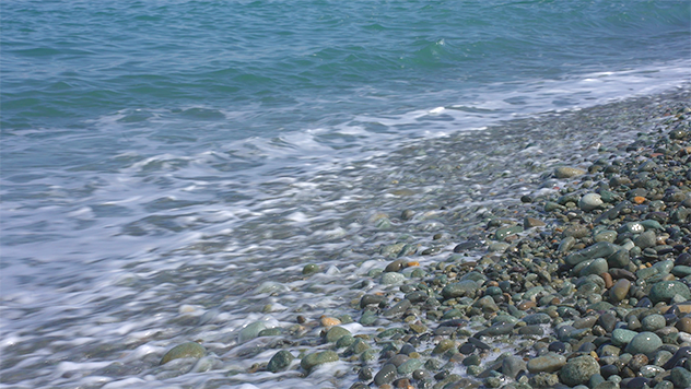丸石が一面に敷き詰められた海岸に立つと、